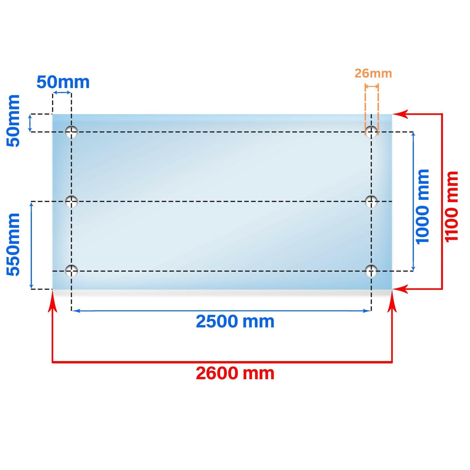 De bevestigingspunten, de punten waar het balkon verankerd zal worden, moeten als volgende worden overwogen. In het voorbeeld van een 2300mm breed glas, zouden de bevestigingspunten doorgaans op 2200mm van elkaar worden geplaatst.