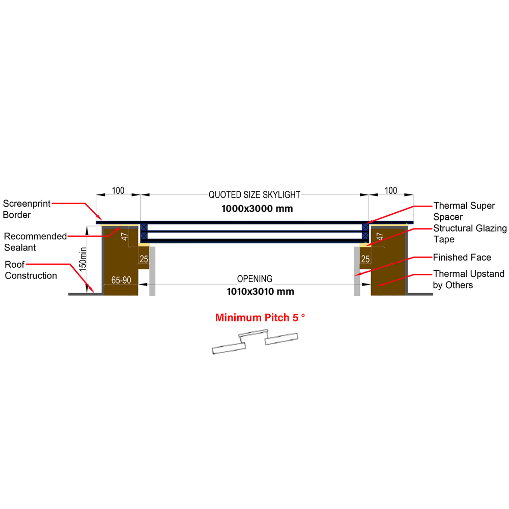 1000 x 3000 mm LD Frameless Triple Glazed Flat Roof Skylight.